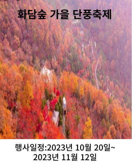 - 현재 화담숲에서 10월 20일부터 11월 중순까지 한달여 간 '가을 단풍 축제'를 진행 하고 있습니다. 국내 단풍 명소로 자리잡은 화담숲은 올 해에도 어김없이 청명한 하늘 아래 시원한 바람과 함께 가을이 찾아와 400여 품종의 형형색색 단풍이 장관을 이룹니다.