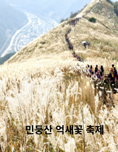 - 민둥산 억새꽃 축제는 강원도 정선군의 민둥산 일대에서 진행되는 축제로 가을철 해발 1,118m의 민둥산이 억새꽃으로 덮여 장관을 이루는 광경을 관광객들에게 알리기 위해 만들어진 축제입니다.