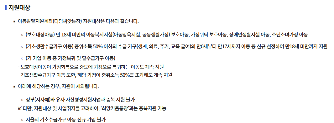 - 대상 확대: 올해부터는 0~18세 미만이면서 중위소득 50% 이하인 모든 가구 아동이 디딤씨앗통장에 가입할 수 있습니다. 이로 인해 많은 가정이 이 혜택을 받을 수 있게 되었습니다.