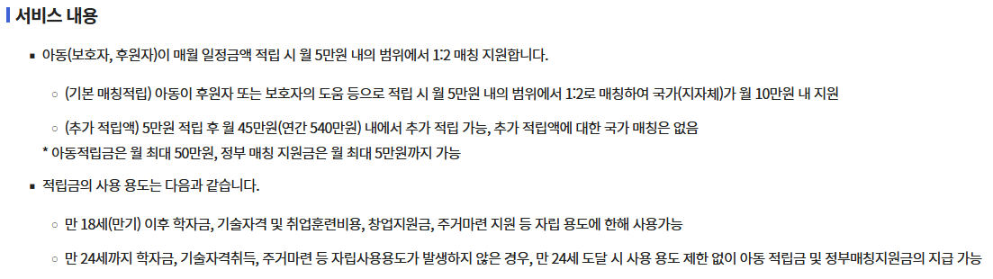 - 이 지원은 매월 저축한 금액에 따라 정부 매칭 지원금으로 제공되며, 작년까지는 12~18세 미만이면서 중위소득 40% 이하 가구 아동에게 제한되었으나, 올해부터는 0~18세 미만이면서 중위소득 50% 이하인 모든 가구 아동이 참여할 수 있게 되었습니다. 내용 삽입