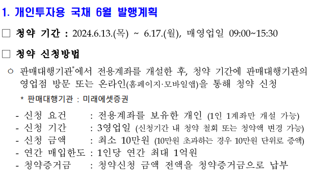 개인투자용 국채는 특정 기간 동안만 청약이 가능합니다. 구매를 희망하는 투자자들은 다음 청약기간을 잘 기억해두어야 합니다: