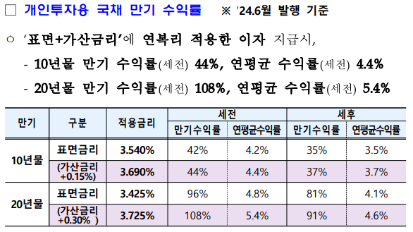 이달 발행 물량의 만기 수익률(세전)을 따져보면, 10년물은 약 44%, 20년물은 약 108%에 달합니다. 이는 장기적인 수익을 추구하는 투자자에게 큰 매력을 제공합니다.