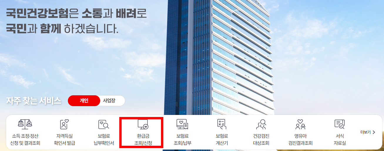 - 개인 민원 메뉴 선택: 상단 메뉴에서 "개인 민원"을 클릭하고, 그 안에서 "환급금 조회/신청" 메뉴를 선택합니다.