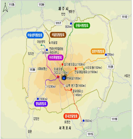 등산코스:관음사지구 야영장-탐라계곡-개미등-삼각봉 대피소-백록담 정상