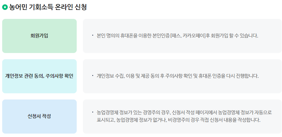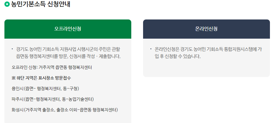 - 경기도 농민기본소득 통합지원시스템에 가입한 후, 온라인으로 신청하는 방법입니다. 온라인 신청은 방문 신청보다 간편하고 빠르게 진행할 수 있으며, 인터넷 환경만 있으면 언제든지 신청할 수 있습니다.