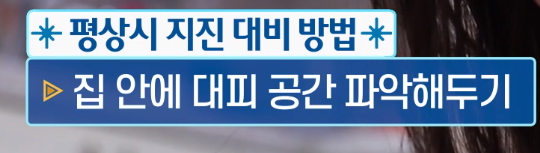 - 탁자 아래와 같이 집 안에서 대피할 수 있는 안전한 대피 공간을 미리 파악해 둡니다.