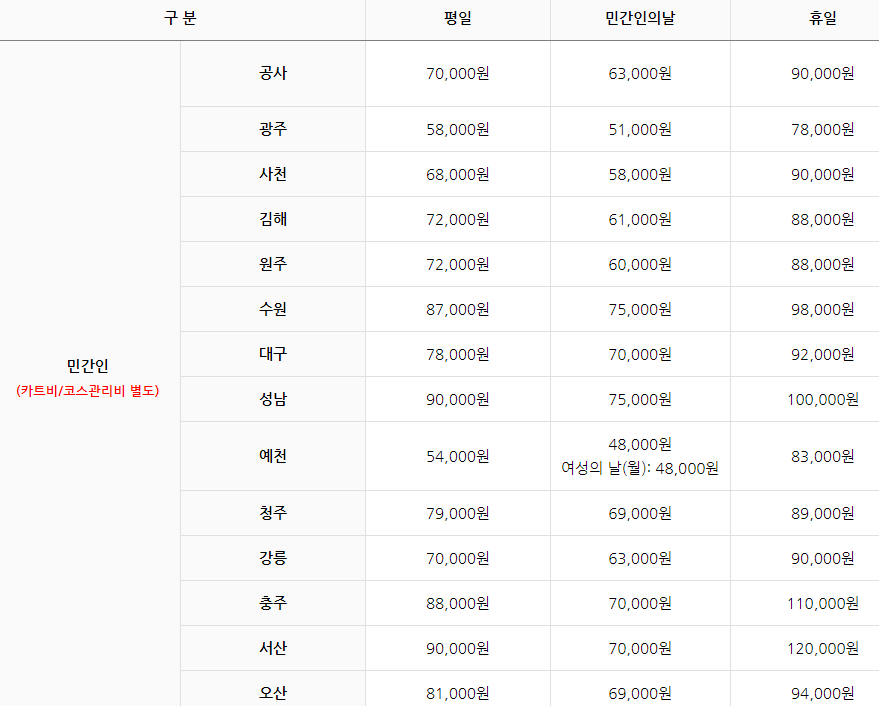 민간인의 경우 평일과 주말, 공휴일 요금이 상이하며, 지역별로도 차이가 있습니다.