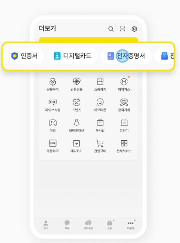 '더보기' 메뉴 내에서 '인증서' 버튼을 선택합니다.