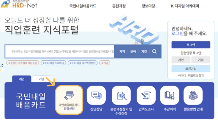 HRD-Net 홈페이지에 로그인 한 뒤 나의 정보 페이지에서 '나의 카드-국민내일 배움 카드-발급신청'