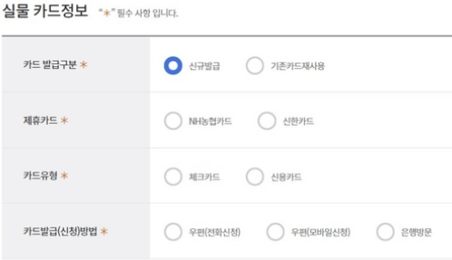 선택 사항으로는 카드정보를 입력하고, 내일 배움 카드는 농협카드와 신한카드에서만 발급가능해요
