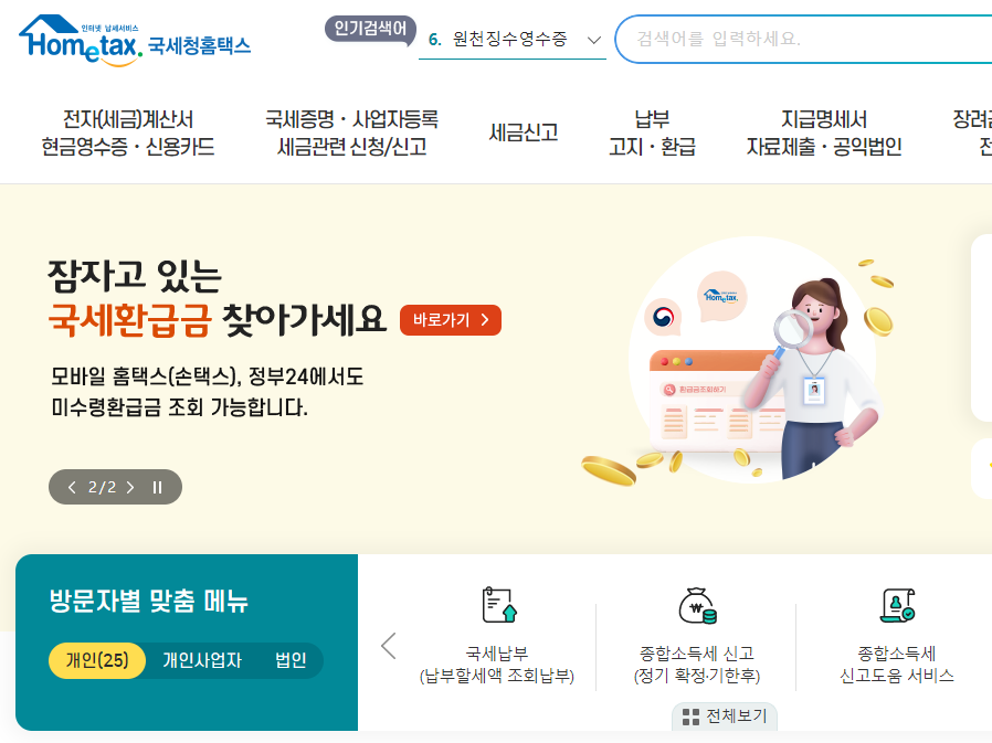 먼저 네이버나 구글에서 "홈택스"를 검색하면 국세청 홈택스 공식 홈페이지가 나옵니다. 해당 사이트에 접속해주세요.