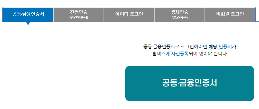 로그인 화면에서는 공동인증서 또는 간편인증 중 하나를 선택해 로그인합니다.