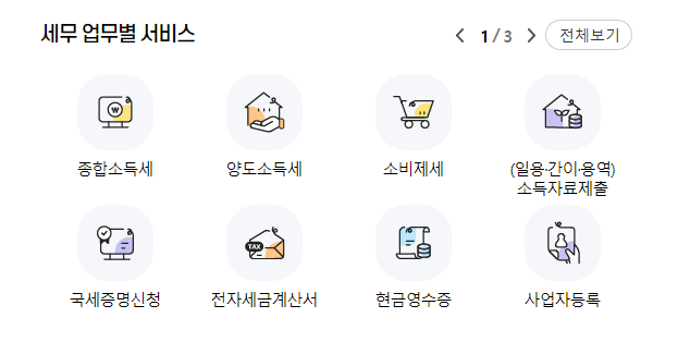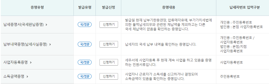 홈페이지 메인 페이지에서 조금만 내려가면 "국세증명신청" 메뉴가 보입니다. 해당 메뉴를 클릭한 후 "납세증명서 클릭하기"를 선택합니다.