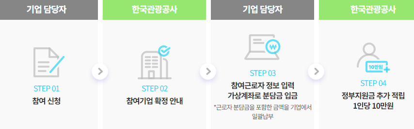 참여 신청 - 참여기업 확정 안내 - 참여근로자 정보 입력 및 가상계좌로 분담금 입금 - 정부지원금 추가 적립 1인당 10만원