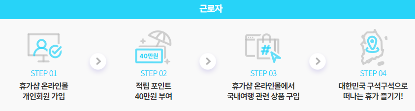 근로자는 휴가몰에서 개인회원 가입 후 적립된 포인트 40만 원을 숙박, 항공권 및 기차, 패키지 상품, 렌터카 등 국내여행 관련 상품 구입에 사용할 수 있습니다.