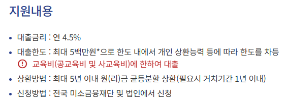 - 지원 내용 이 프로그램에서는 최대 5백만 원까지의 금액을 4.5%의 이자로 지원합니다. 이를 통해 가정 내 경제적 어려움으로 인해 공부에 집중하기 어려운 학생들이 학습 활동에 보다 적극적으로 참여할 수 있도록 지원합니다.