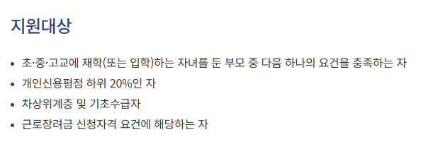 - 지원 대상 이 프로그램은 근로장려금 수령자가 가정의 경제적 어려움으로 인해 학습 활동에 참여하기 어려운 경우를 대상으로 합니다. 방과 후 학교 활동, 고교 수업료, 학원비 등의 지출에 어려움을 겪는 분들이 해당됩니다.