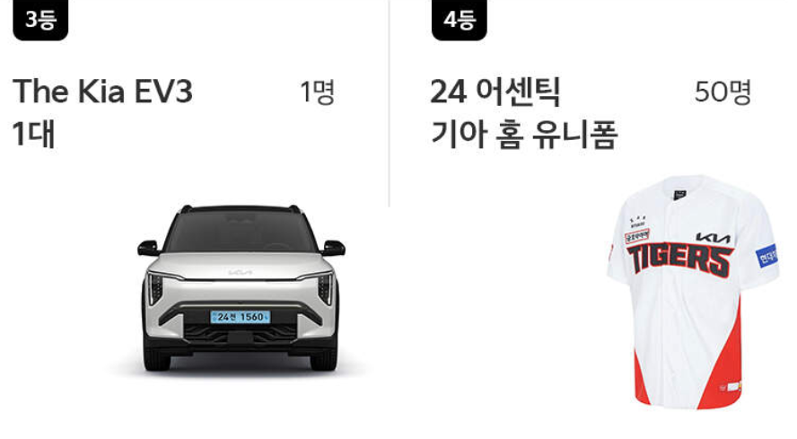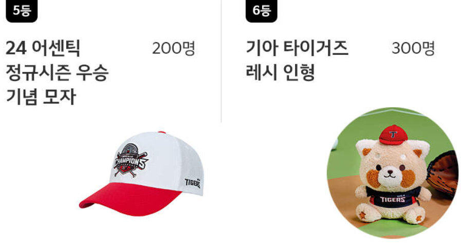- 기아는 타이거즈 팬들이 우승을 더욱 가까이서 기념할 수 있도록 특별한 기념상품들을 준비했습니다. 기아 타이거즈의 홈 유니폼, 우승 기념 모자, 레시 인형 등 팬들이 좋아하는 상품이 경품으로 제공되어 팬들에게 잊지 못할 추억을 선사할 것입니다.