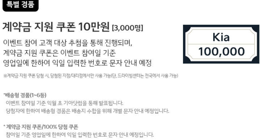 또한, 참여 고객 전원에게 메가커피 기프티콘을 증정하고, 계약 고객 중 총 3000명을 선정해 계약금 지원 쿠폰을 제공할 예정입니다. 고객들은 기아 스토어 방문만으로도 커피 기프티콘과 다양한 경품에 도전할 수 있어 참여가 쉽고 부담이 적습니다.