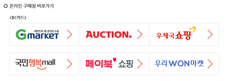 - 온라인: 삼성카드 쇼핑몰, 국민행복몰