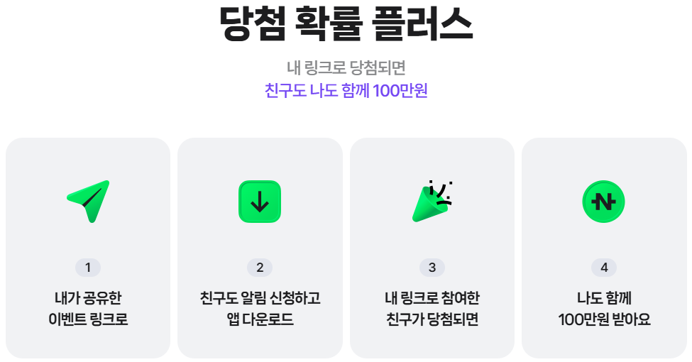 - 만약 친구가 당첨될 경우, 추천인에게도 100만 원의 네이버페이 포인트가 추가로 지급됩니다!