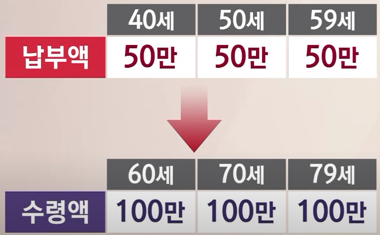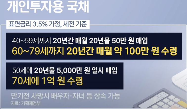 개인투자용 국채 20년물로 금리는 연 3.5%, 납입액 매월 50만 원, 납입기간은 40세부터 60세까지 20년이며, 수령액은 60세부터 80세까지 이자 포함 매월 100만 수령하여 노후 준비에 활용할 수 있습니다.
