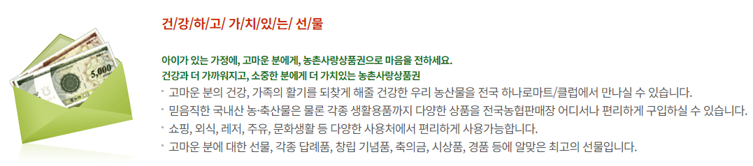 - 농협몰: 온라인 쇼핑몰을 통해 상품권 사용 가능