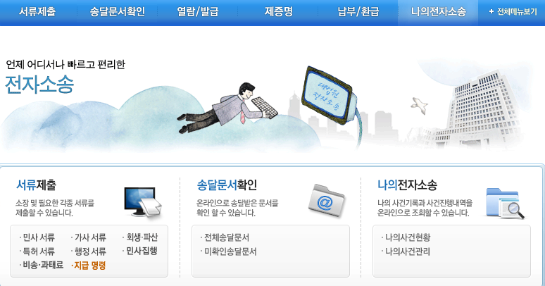 ‘나의 전자소송’ 메뉴에서 사건을 등록한 뒤, 관련 서류를 열람하거나 출력할 수 있습니다.