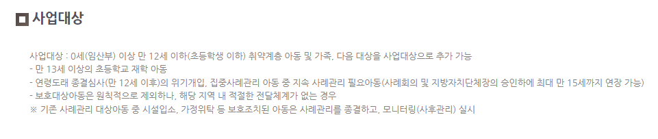 - 연령 도래 후 계속적인 사례관리가 필요한 아동: 만 12세가 되었더라도 연령 도래 종경심사나 집중사례관리를 통해 계속적인 지원이 필요하다고 판단되는 아동은 지원을 받을 수 있습니다.