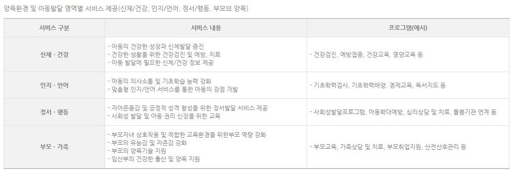 - 건강검진 및 예방접종: 아동의 건강 상태를 정기적으로 점검하고, 필요한 예방접종을 제공합니다.