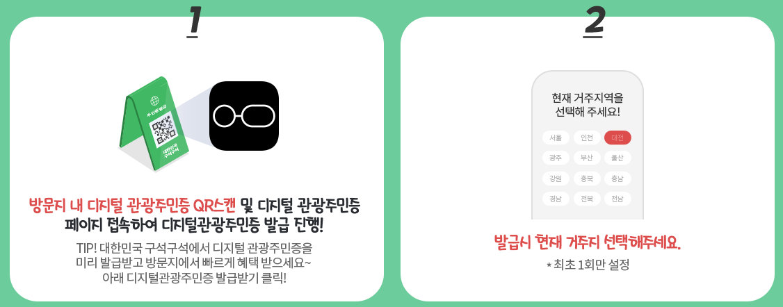 - 거주지 발급 제한: 자신의 실제 거주지에서는 디지털 관광주민증을 발급받을 수 없습니다. 거주지를 제외한 다른 지역에서만 발급이 가능하니, 이 점을 반드시 확인하세요.