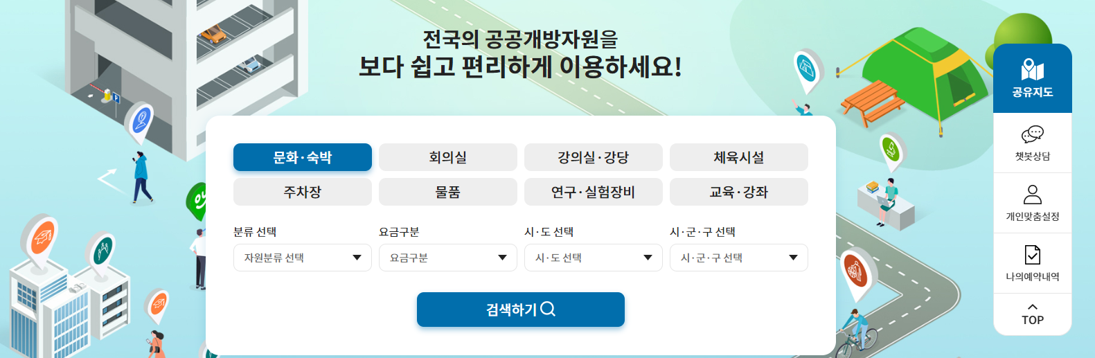 - 체육시설: 공공 체육관, 운동장, 야외 체육시설 등을 검색하고 예약할 수 있습니다.