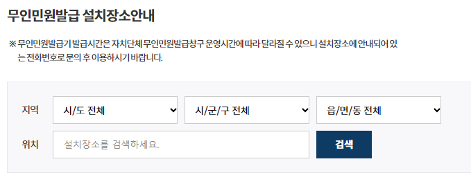 - 지역 선택 및 설치 장소 확인: 원하는 지역을 선택하면 해당 지역의 무인민원발급기 위치와 운영 시간을 확인할 수 있습니다.