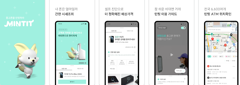 - 시세조회: 민팃 어플 또는 ATM을 통해 중고폰의 시세를 조회할 수 있습니다. 스마트폰의 상태를 입력하거나 민팃 ATM에 직접 기기를 넣으면, 액정, 외관, 카메라 상태를 검사하여 시세를 책정합니다.