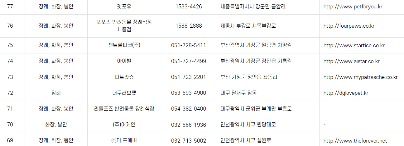 - 화장: 화장 과정은 약 1~2시간 소요되며, 주인이 원하는 경우 화장 과정을 지켜볼 수 있습니다.
