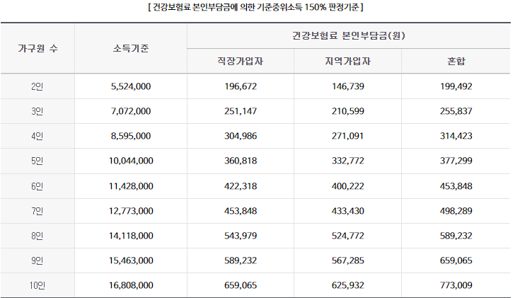 - 건강보험료 기준: 산모 및 배우자의 건강보험료 본인부담금 합산액이 기준 중위소득 150% 이하에 해당하는 가정