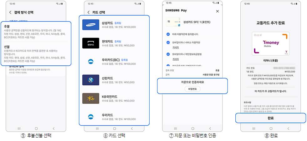 - 교통카드를 등록한 후, 지문이나 비밀번호로 인증을 완료하고, 삼성페이를 기본 결제 수단으로 설정하세요. 이 단계에서 소득공제 신청도 가능합니다.