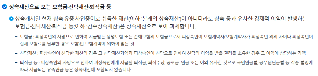 - 상속세는 다양한 자산에 적용될 수 있으며, 부동산, 금융자산, 그리고 기타 유형의 재산이 모두 포함됩니다. 상속인이 상속받는 자산의 가치를 평가하여 과세표준을 산정하고, 이 과세표준에 따라 상속세를 납부하게 됩니다.