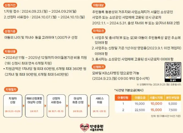이 프로그램은 서울시의 저출생 대책인 **'탄생응원 서울프로젝트'**의 일환으로 시행되며, 특히 아이를 돌봐줄 사람이 부족한 가정에 큰 도움이 될 것으로 기대됩니다.