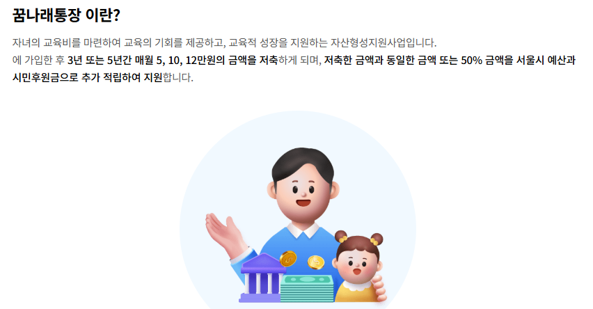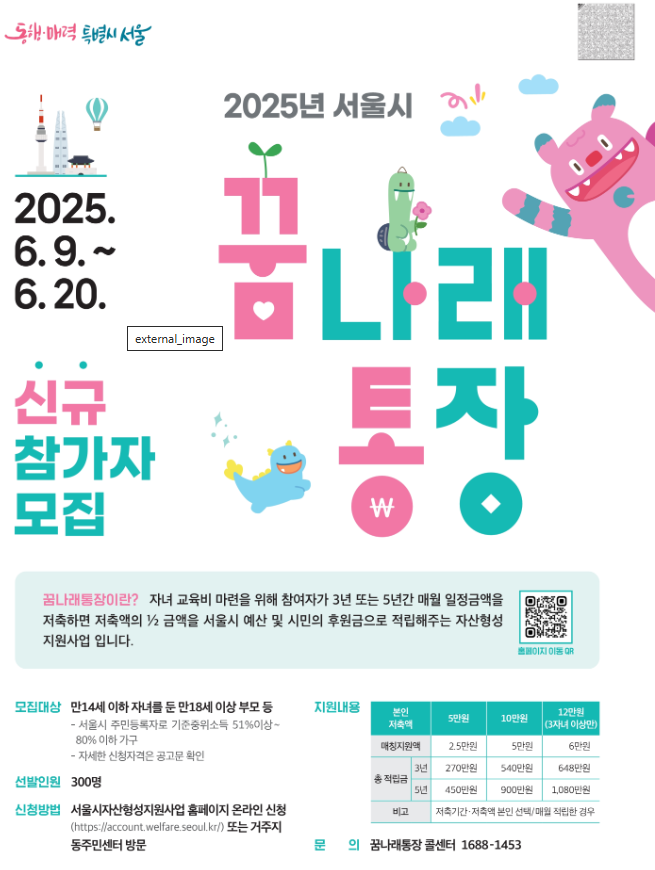 서울시에 거주하며 자녀 양육에 필요한 교육비나 돌봄 비용 등을 마련하기 어려운 저소득 가정에게 희소식이 있습니다. 바로 2025년 서울시 꿈나래통장 신규 모집이 시작된 것인데요. 본인이 일정 금액을 매달 저축하면, 서울시와 민간 후원금이 추가로 매칭되어 자녀 교육비, 학원비, 입시 준비 비용 등으로 사용할 수 있도록 도와주는 장기 저축 프로그램입니다.