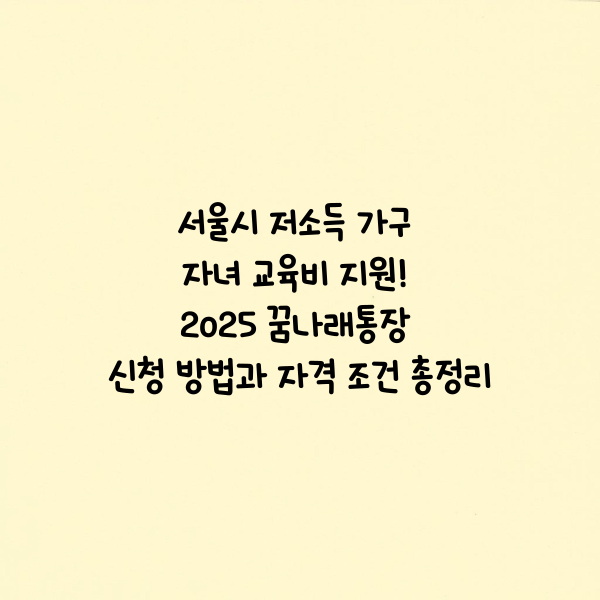 서울시 꿈나래통장은 단순한 저축 통장 그 이상입니다. 자녀의 미래를 위한 안정적인 교육 자금을 마련할 수 있는 기회이자, 저소득 가구의 부담을 실질적으로 줄여주는 유용한 제도입니다. 특히 수급자 또는 다자녀 가구의 경우 100% 매칭금 혜택까지 받을 수 있으니, 이번 2025년 신청 기간을 놓치지 마세요.