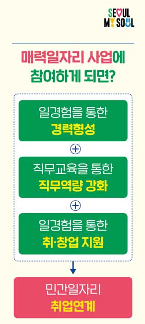 - 서울 매력일자리는 서울시가 주관하는 일자리 지원 프로그램으로, 공공 및 민간 분야에서 다양한 직무 경험과 전문적인 교육을 제공하여 취업 역량을 강화하는 것을 목표로 합니다.
