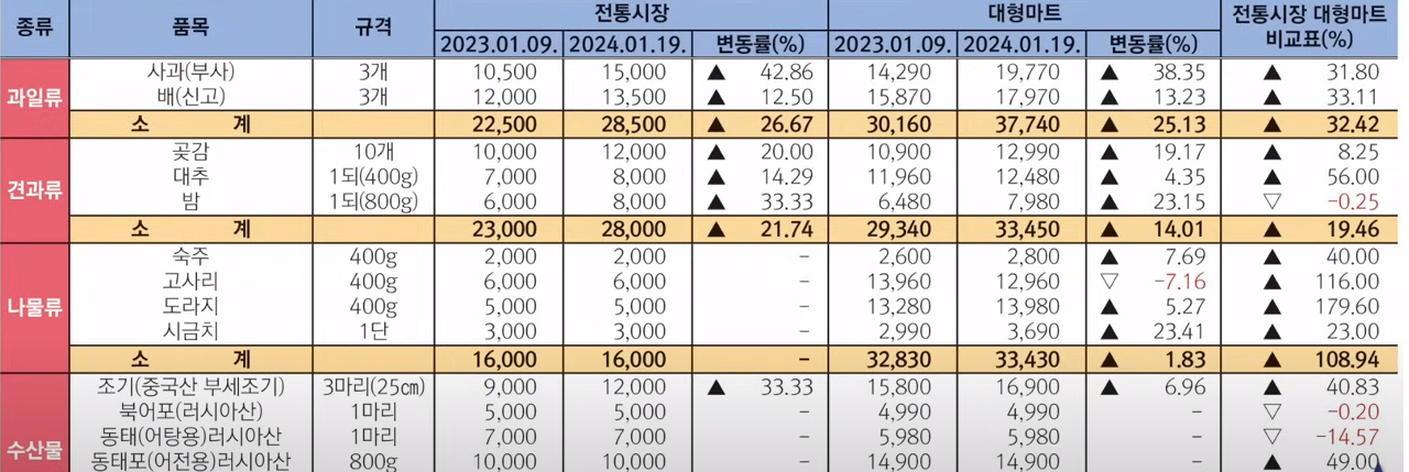 최근 조사된 과일 가격을 보면 전통시장은 사과 3개에 15,000원, 대형마트는 19,770원으로 조사되었고 배 3개는 전통시장 13,500원, 대형마트는 17,970원으로 조사됐습니다. 전통시장과 대형마트 모두 작년에 비해 큰 폭으로 올라 전체적으로 비싸졌습니다.