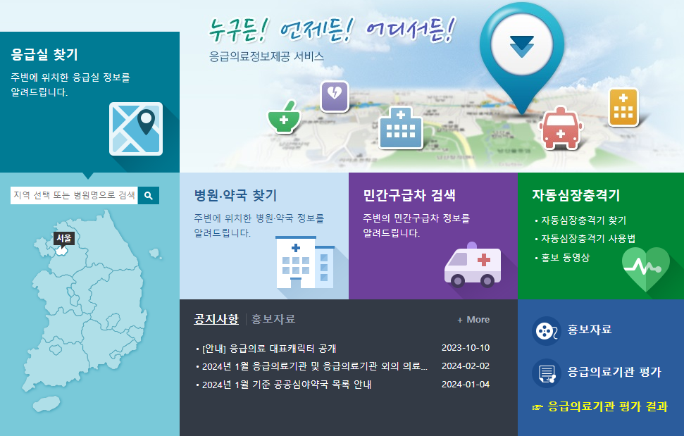 보건 복지부와 국립 중앙 의료원에서 운영하는 응급의료포털로서 나의 위치정보를 기반으로 현재 지역의 병원이나 약국, 응급실에 대한 실시간 정보를 제공 하며 위치설정에 따라 필요한 지역의 정보도 알 수 있어 응급 상황시 이용 가능합니다.