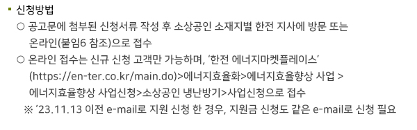 - 신청 방법은 온라인 접수만 가능하며, 소상공인 냉난방기 지원사업의 공식 홈페이지를 통해 신청서를 제출하면 됩니다.