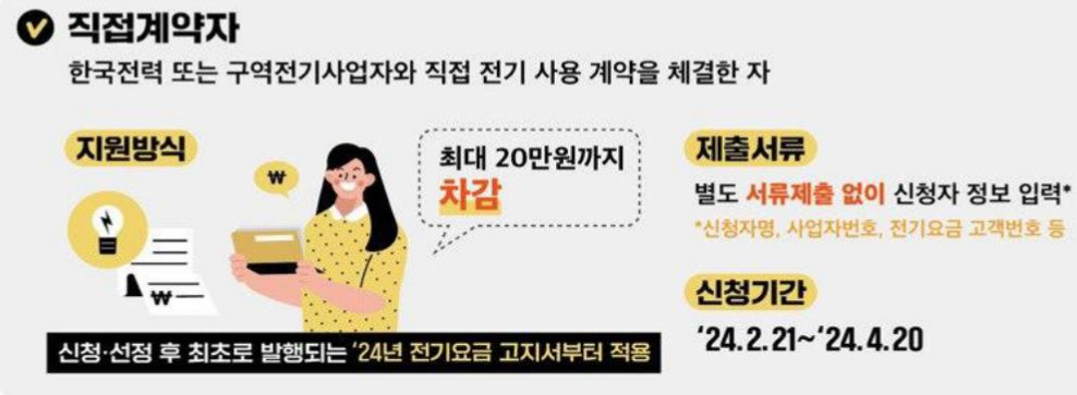 한국전력과 사용계약을 체결한 '직접 계약자'는 2월 21일부터 4월 20일까지 2개월간 신청이 가능하며 직접계약자의 경우 고지서 상 전기요금을 차감하는 방식으로 지원이 이루어지며 대상으로 통보된 후 최초로 발행되는 고지서부터 차감 혜택이 자동으로 적용됩니다.