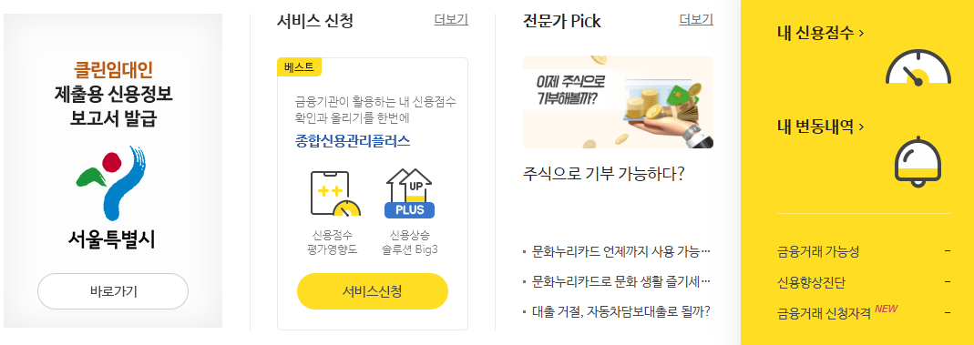 - 카카오: 카카오 앱에서도 신용점수를 손쉽게 조회할 수 있습니다. 카카오 앱을 다운로드한 후, 다음 경로를 통해 신용점수를 확인하세요.