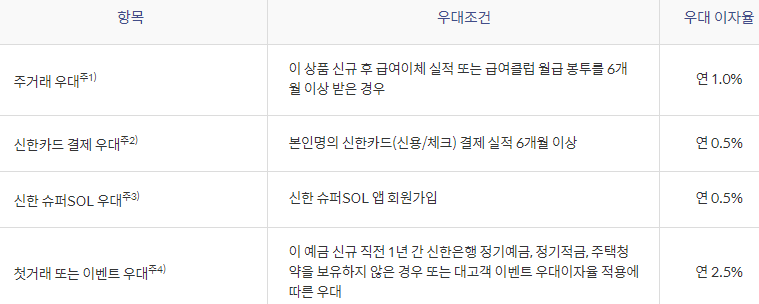 - 신한카드 결제 우대 (0.5%): 1원 이상의 결제 실적 보유 시 해당 월 실적으로 인정