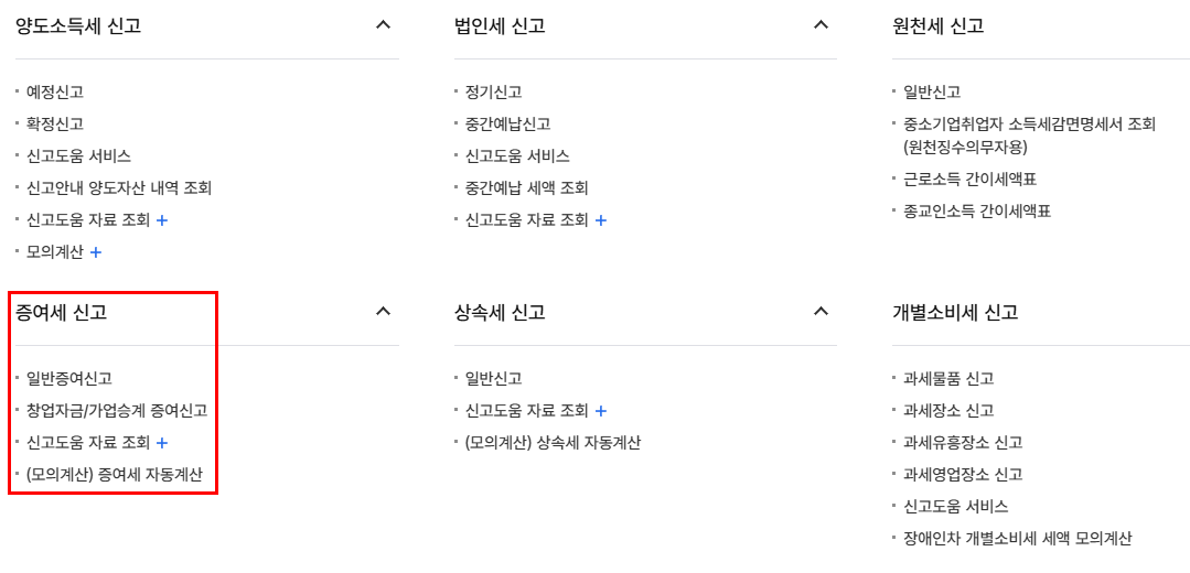 - [세금신고] → [증여세] → [일반증여 신고] 선택