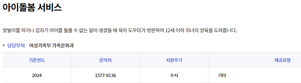 - 활동내용: 일반적인 아이돌봄 활동을 제공하며, 가사활동은 제외됩니다.